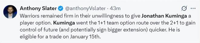根据勇士队记者安东尼-斯莱德的报道,库明加与勇士队签下的是1+1合同,这份合同第二年是球员选项,他可以在2026年夏成为完全自由球员,同时勇士队也可以在1月15日后探索交易库明加。